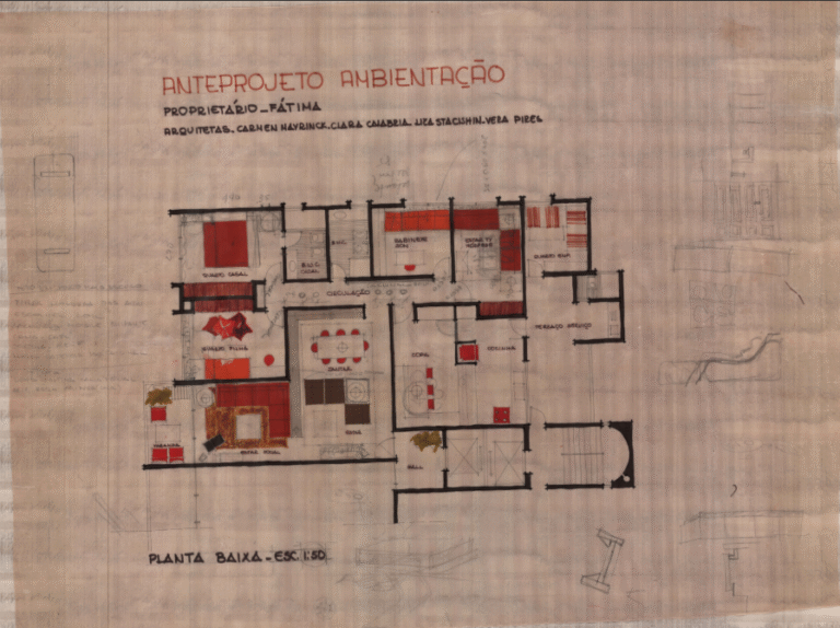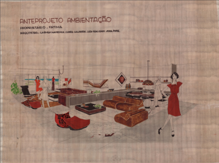 O anteprojeto de ambientação da proprietária Fátima, encontra-se no acervo uma planta baixa e uma perspectiva.